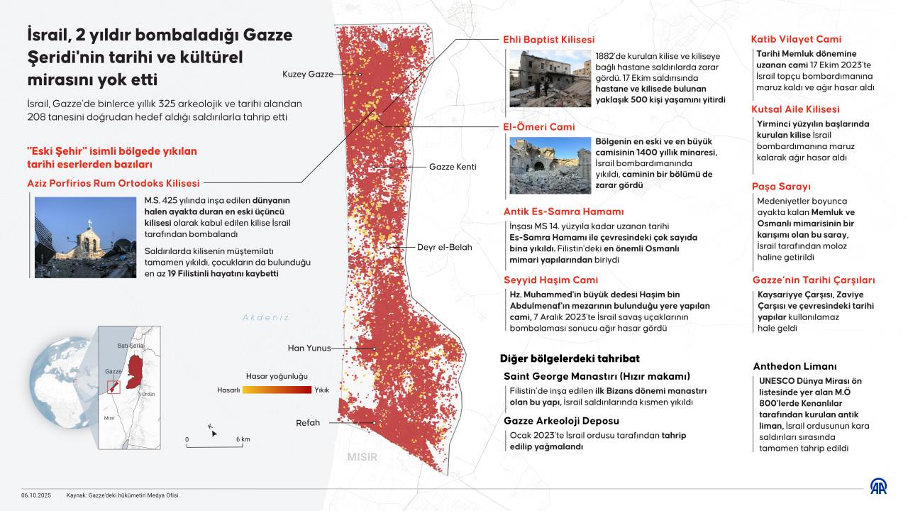 Gazze’deki hükümetin Medya Ofisi verilerine göre İsrail, Gazze’de binlerce yıllık 325 arkeolojik ve tarihi alandan 208’ini doğrudan hedef aldığı saldırılarla tahrip etti.