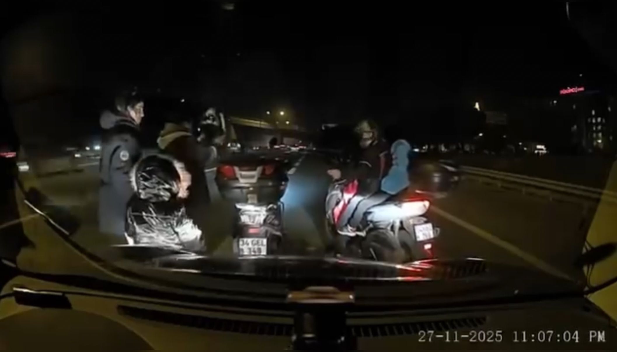 Tartışma sırasında yaşanan ihmaller zinciri bununla da sınırlı kalmadı. Kadın sürücü, kaskı olmayan çocuğuyla tekrar motosiklete bindiği sırada, otoyolda seyreden başka bir motosiklet sürücüsü de olaya dahil olmak için durdu.