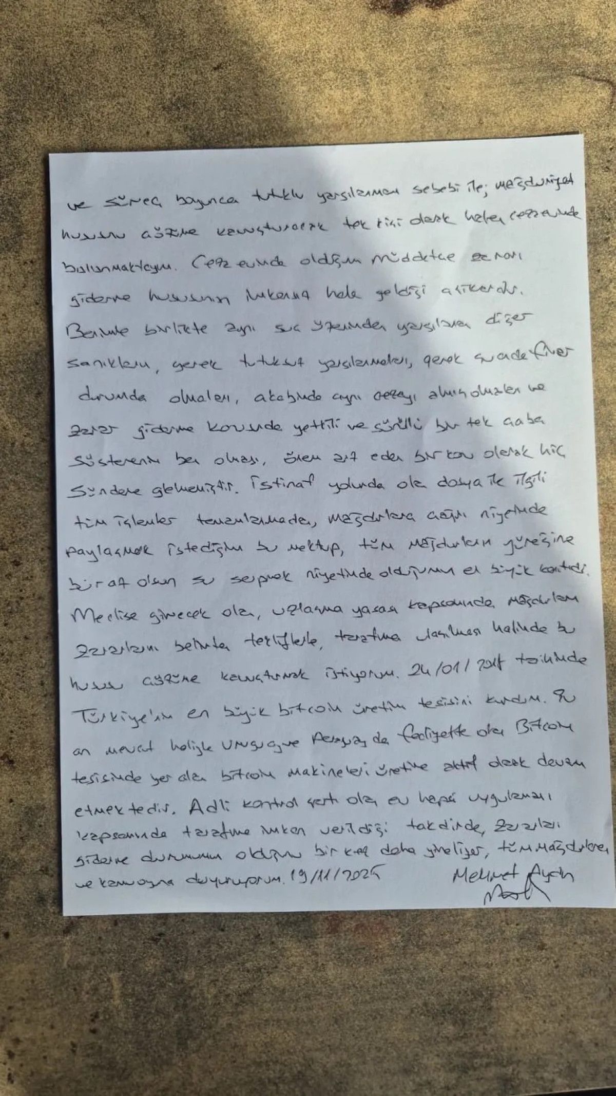 Tosuncuk lakaplı Mehmet Aydın’dan mektup